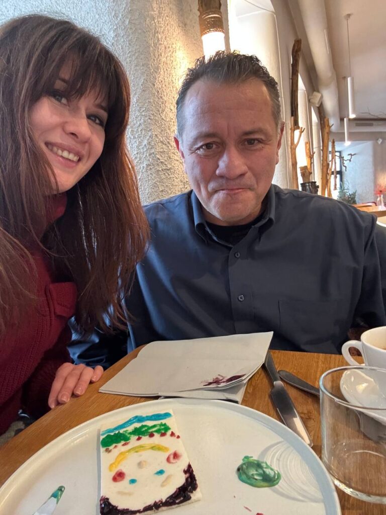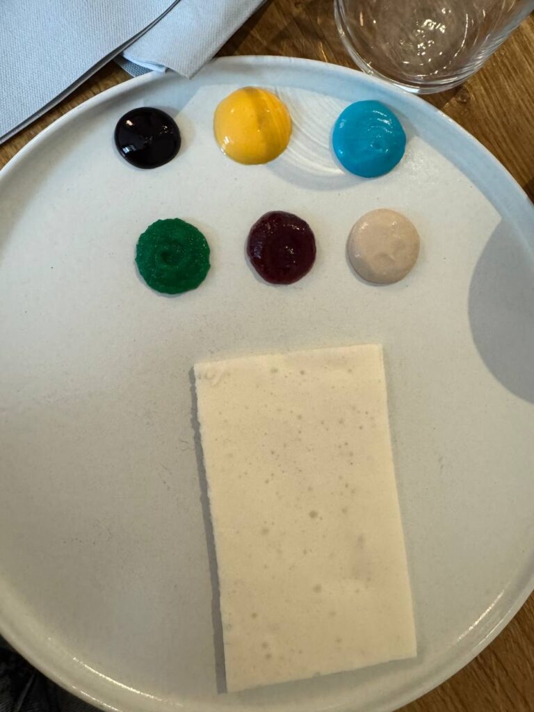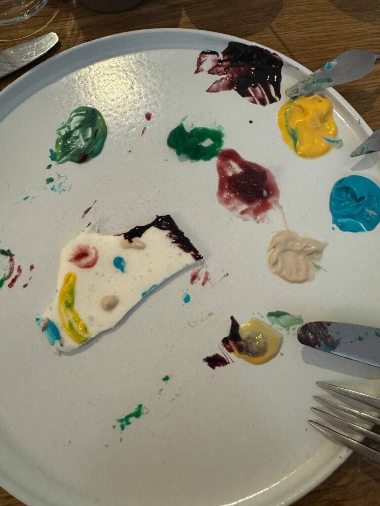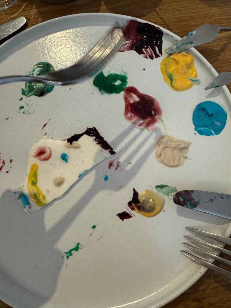 The wonderful Ukrainian restaurant knows Anna well and they saw here and made a special “Birthday Cake” for her. The white slab is tapioca pudding and each colored dolop is a flavored frosting. We could taste blackberry and raspberry, but the others were kind of mysterious. They told us to make a painting and enjoy! We decided to make a portait of anna!