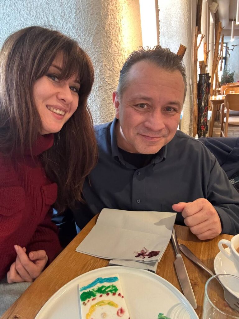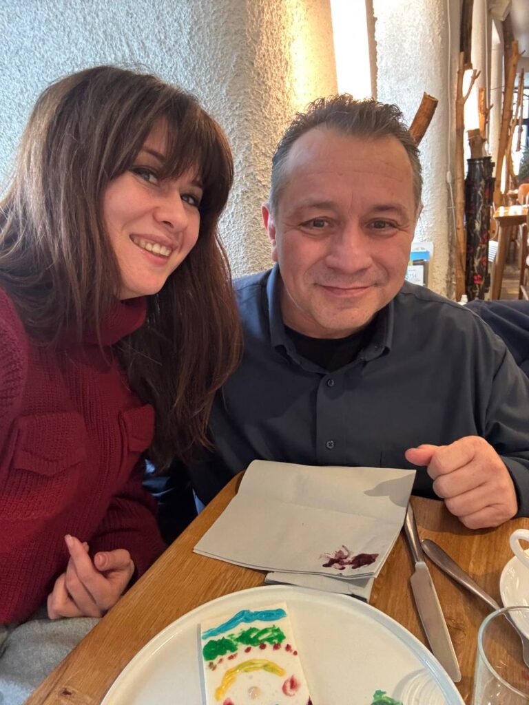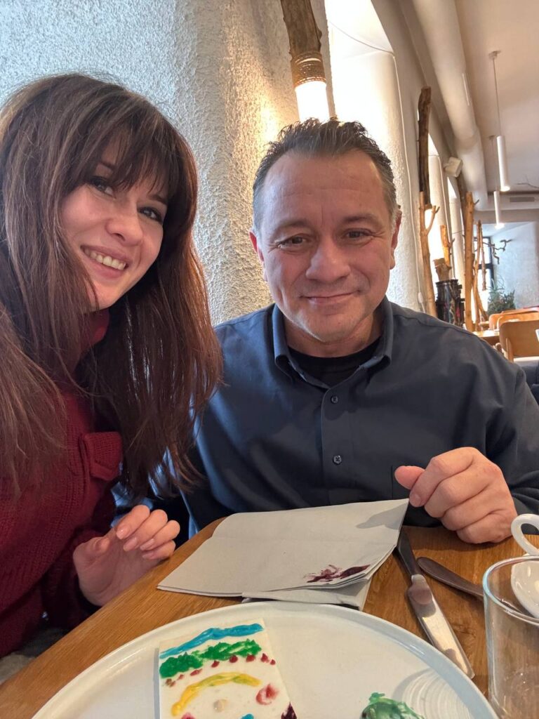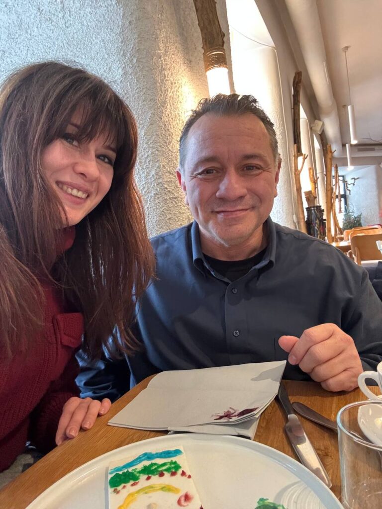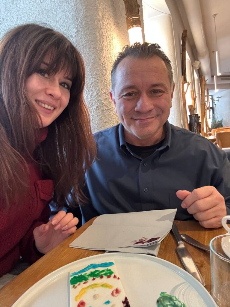 The wonderful Ukrainian restaurant knows Anna well and they saw here and made a special “Birthday Cake” for her. The white slab is tapioca pudding and each colored dolop is a flavored frosting. We could taste blackberry and raspberry, but the others were kind of mysterious. They told us to make a painting and enjoy! We decided to make a portait of anna!